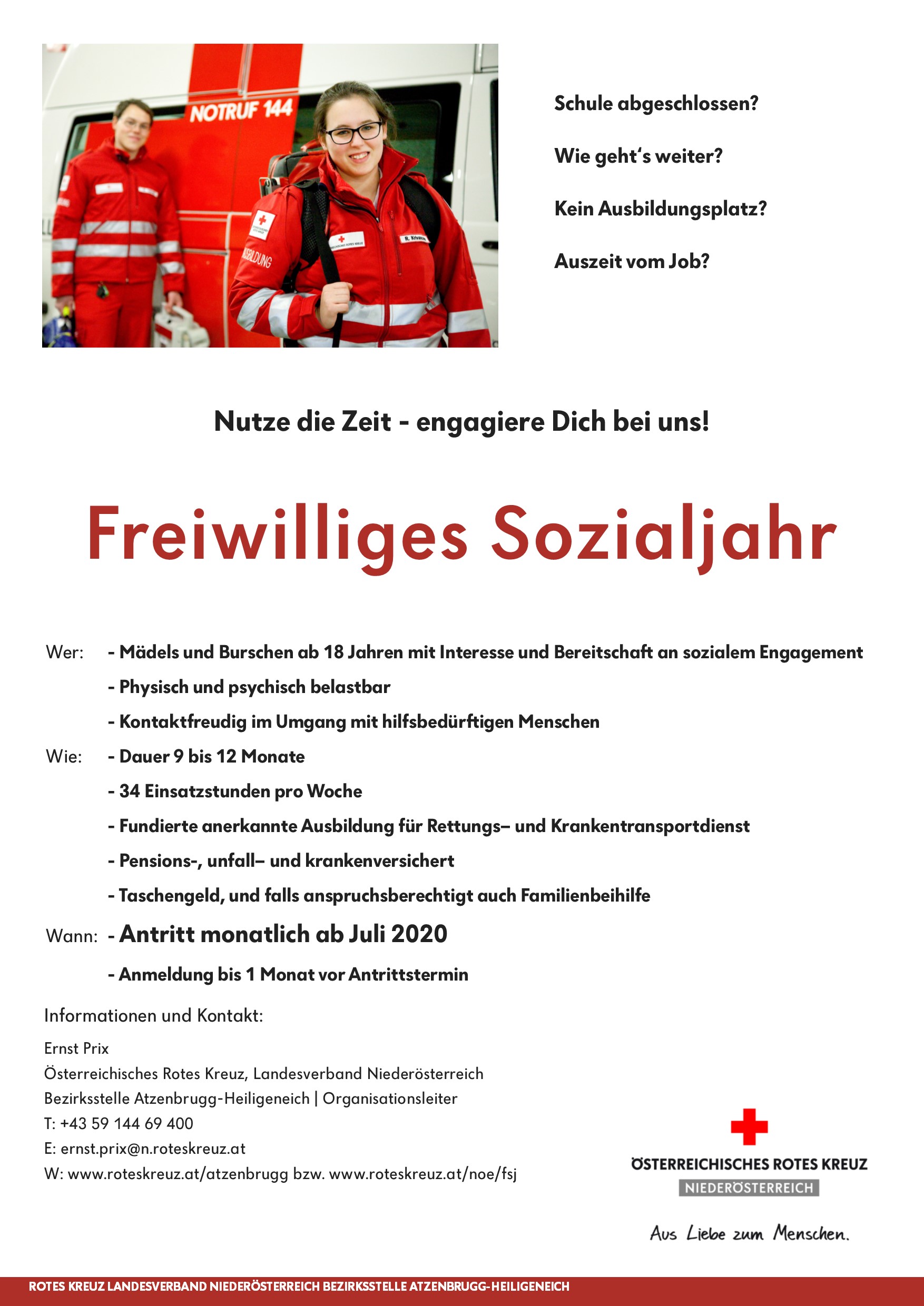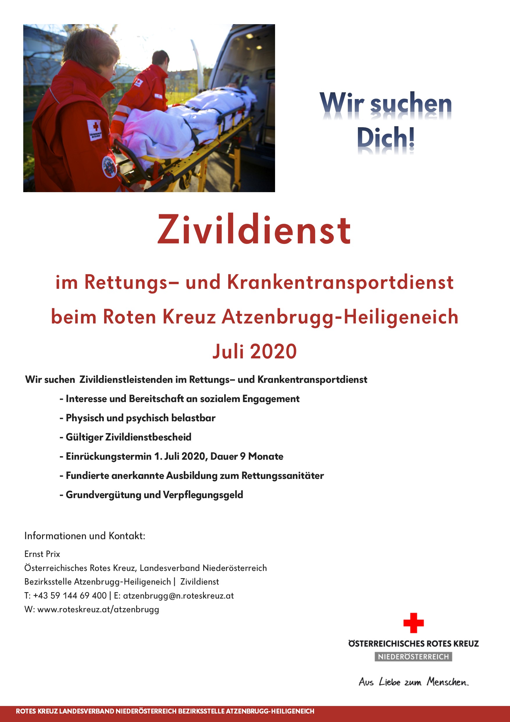 Wenn du Interesse hast und bereits einen gültigen Zivildienstbescheid hast, melde dich bitte bei der Rotkreuz Bezirksstelle Atzenbrugg-Heiligeneich unter +43 59 144/69 400 oder atzenbrugg@n.roteskreuz.at